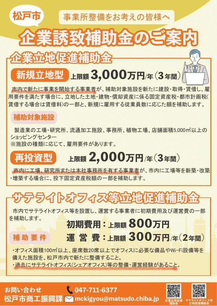 「松戸市企業立地促進補助金」は、固定資産税等や賃借料に対する補助のほか、松戸市内へ転入する従業員に対する雇用奨励補助支援もあります。