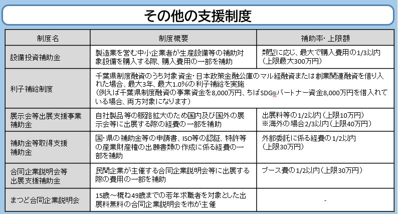 また、市内事業者様が「設備投資」、「建物の改築・増築」等の再投資を行った際の補助制度もご用意しております。その他、無料の経営相談窓口や各種事業を運営する際の補助制度など松戸に立地いただいた事業者様が生産性の向上や経営の安定に繋がるべく取り組んでおります。